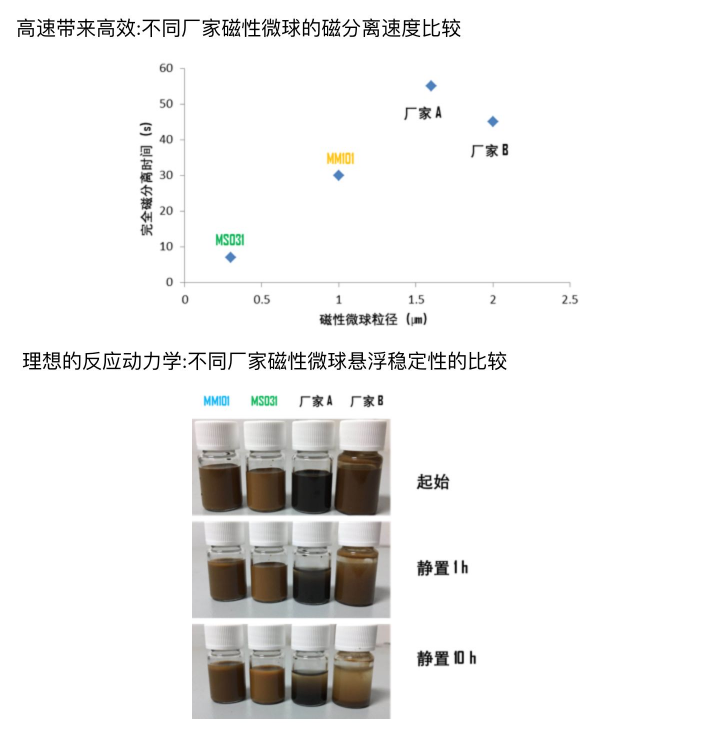 穩(wěn)定性:在1-13 pH范圍內(nèi)可以穩(wěn)定分散(注:長時(shí)間處于過酸環(huán)境下,可能由于氫離子向微球內(nèi)的滲透而導(dǎo)致磁顆粒被酸解),無外加磁場時(shí)可以長時(shí)間穩(wěn)定懸浮,大大提高反應(yīng)效率