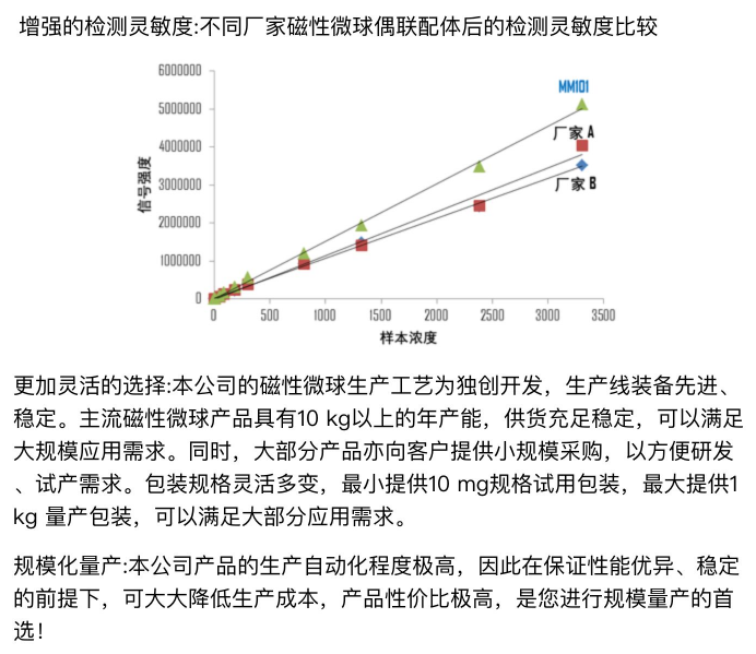 在磁場作用下可以迅速遷移,磁場撤除后無剩磁,能很快重新分散。磁性部分之外包裹一層聚合物,將磁顆粒完全封閉在微球內(nèi)部。最后在表面修飾一層特殊親水材料(同樣應(yīng)用于本公司所有磁性微球類產(chǎn)品),賦予微球親水性、極佳的懸浮穩(wěn)定性。可如液體一般進(jìn)行取用,操作方便,可適應(yīng)不同的緩沖溶液和酸堿環(huán)境。規(guī)整的球形形貌,可將非特異性吸附作用降至最低,并降低微球團(tuán)聚的風(fēng)險(xiǎn)。