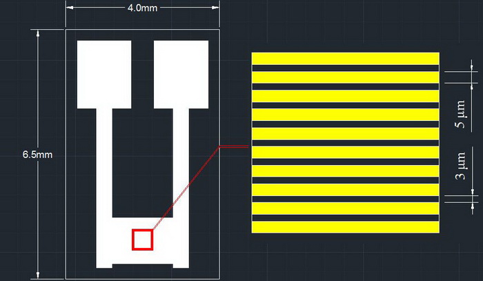 2.線寬:5 u m,線距:3 u m,指長(zhǎng):1.6mm,叉指對(duì)數(shù):75(150指).