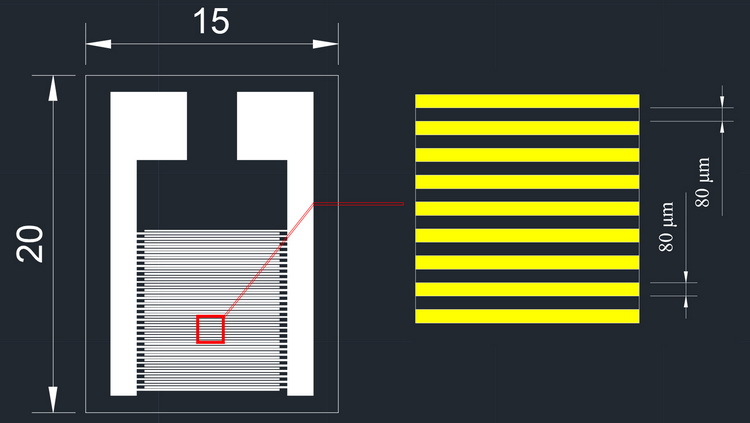 2.線寬:80um,線距:8oum,指長:8.5mm,叉指對數: 30(60指).