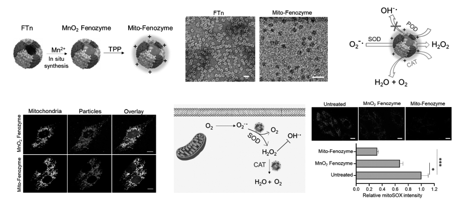 產品性能:選用人源鐵蛋白重鏈重組蛋白作為蛋白骨架,利用其自身天然親和金屬離子的能力,原位合成了鐵蛋白/MnO2 納米酶。通過三苯基膦(triphenylphosphonium,TPP)的進一步修飾獲得了具有線粒體靶向能力的雜化納米酶(Mito-Fenozyme)。結果顯示,該Mito-Fenozyme納米酶具有較高的SOD酶活性,并且顯示出比較好的過氧化氫酶(CAT)活性。更為有意思的是,該納米酶未顯示出明顯的過氧化物酶(POD)活性,這一特性使得Mito-Fenozyme納米酶不僅能夠通過SOD-CAT級聯反應有效清除O2•–,還能避免由POD誘導產生高細胞毒性的羥基自由基(•OH)。細胞試驗也進一步證實了該納米酶具有靶向線粒體及清除線粒體來源O2•-的能力