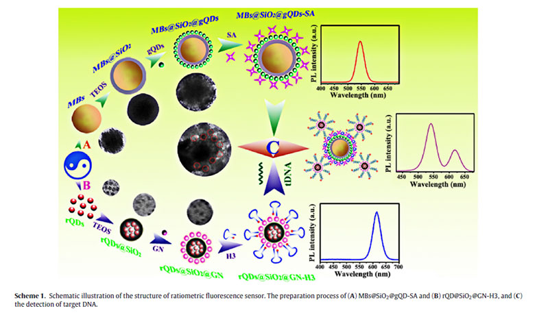 由華中農(nóng)業(yè)大學(xué)、廣西民族大學(xué)應(yīng)用的CdSe/ZnS量子點(diǎn)研制出用于Bt的特異性選擇性檢測的熒光傳感器:在檢測中,當(dāng)沒有檢測目標(biāo)存在時(shí),熒光信號(hào)分析中只存在gQDs的信號(hào)輸出,發(fā)夾DNA結(jié)構(gòu)處于未打開狀態(tài);當(dāng)檢測目標(biāo)存在時(shí),目標(biāo)DNA序列將與發(fā)夾DNA雜交實(shí)現(xiàn)開環(huán),rQDs@SiO2被MBs@SiO2@gQDs@SA捕獲,連接后的整體由于熒光共振能量轉(zhuǎn)移(FRET),rQDs的熒光強(qiáng)度 (I620)增強(qiáng),gQDs的熒光強(qiáng)度(I540) 減弱。數(shù)據(jù)分析顯示,在Bt檢測中比率熒光(I620/I540)呈現(xiàn)出較好的線性和較高的靈敏度。該文章發(fā)表在由Elsevier主辦的2017年最新一期Sensors and Actuators B上,該雜志2016年影響因子為5.4,屬于中科院JCR期刊一區(qū)。本項(xiàng)研究為生產(chǎn)高效率高穩(wěn)定量子點(diǎn)熒光傳感器提供了一種新型技術(shù)指導(dǎo)方案。