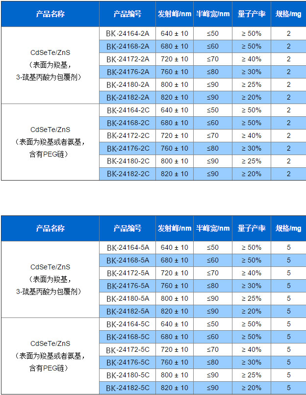 本公司目前可提供四類水溶性CdSeTe/ZnS量子點:(1)表面為負(fù)電荷的羧基,3-巰基丙酸作為包覆劑;(2)表面為負(fù)電荷的羧基,雙親聚合物作為包覆劑;(3)表面為負(fù)電荷的羧基,含有PEG鏈,生物相容性優(yōu)良,可連接帶有氨基的抗體蛋白等;(4)表面為正電荷的氨基,含有PEG鏈,生物相容性優(yōu)良,可連接帶有羧基的抗體蛋白等。