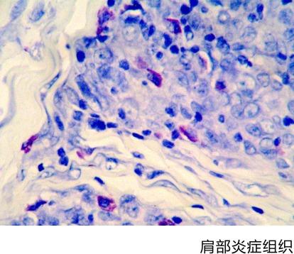 【染色結果】肥大細胞顆粒含有肝素和組織胺等,這些屬于硫酸酯,呈異色性。因此,用易染性染料甲苯胺藍可以使其呈異色性的紅紫色。
