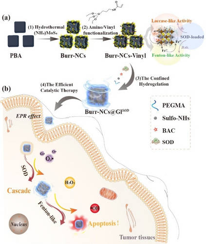 【主要優勢】1、利用毛刺缺陷工程的貴金屬基納米系統內核(毛刺- ncs)和特定的大分子水凝膠網絡外殼,使用受限的水凝膠程序構建了一個界面區隔化納米反應器;