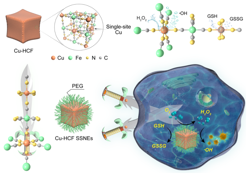 其他說明:密封狀態下保質期半年【主要優勢】1、具有單個銅活性位點的Cu-HCF納米酶在腫瘤微環境中具有級聯酶活性(谷胱甘肽氧化酶和過氧化物酶)。研究發現,Cu-HCF單位點納米酶 (SSNEs)會首先發揮其谷胱甘肽氧化酶的活性以消耗細胞內谷胱甘肽并將單位點CuII轉化為CuI來進一步增強其過氧化物酶活性,從而產生大量的劇毒性羥基自由基,進而促進腫瘤細胞凋亡;實驗結果表明,SSNEs可以有效抑制體內腫瘤的生長,因此這一工作也為實現級聯納米酶的抗癌應用提供了一種新型高效的平臺。