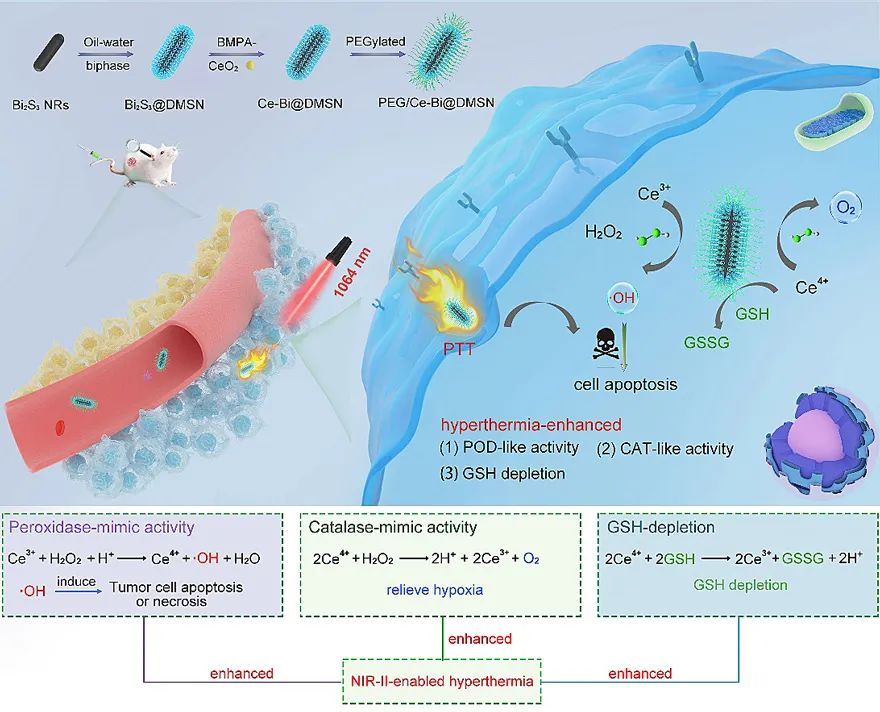 其他說明:密封狀態下保質期半年【主要優勢】1、由于硫化鉍納米棒的存在,該納米酶在1064 nm激光照射下表現出良好的光熱轉換效率(36.2%),能夠實現光熱響應的酶活性調控功能;2、該納米酶在微酸性條件下表現出雙重酶模擬催化活性(類過氧化物酶和類過氧化氫酶),可以有效地調節腫瘤微環境,即同時增加氧化應激并緩解了缺氧引起的腫瘤細胞對活性氧的耐藥性;3、該納米酶可以通過氧化還原反應有效地消耗腫瘤細胞內過表達的谷胱甘肽(GSH);4、該納米酶的兩種酶活性和GSH的耗竭能力在局部光熱的環境下得到了很好的提升。