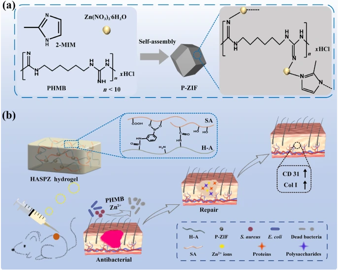 其他說明:密封狀態下保質期半年【主要優勢】通過將聚六亞甲基雙胍(PHMB)負載到 ZIF-8 納米粒子的框架中來獲得 pH 響應性抗菌 P-ZIF(ZIF:沸石咪唑酯框架)。這將使 PHMB 能夠在受感染傷口的弱酸環境中釋放。為了解決燒傷感染問題,將 P-ZIF 納米粒子通過硼酸酯鍵加載到由海藻酸鈉 (SA) 和 3-氨基苯硼酸修飾的類人膠原蛋白 (H-A) 制成的水凝膠系統中