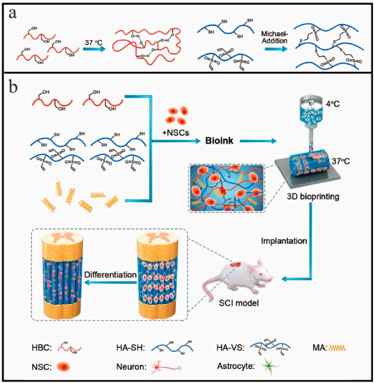 其他說明:密封狀態下保質期半年【主要優勢】利用HBC優異的溫度響應性及HA-SH與HA-VS間邁克爾加成反應的自發二次交聯,“一步法”實現了負載NSCs的神經支架生物3D打印。打印過程流暢、打印線條固化速度快(37 ℃ 20 s內成膠)、成型后的支架結構穩定、打印后支架內NSCs的存活率可達95%