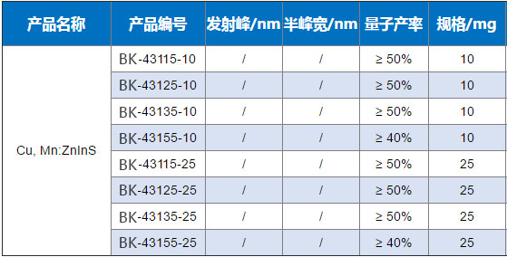 蘇州北科納米科技有限公司生產的油溶性Cu,Mn共摻雜量子點產品,平均的量子產率為50%,儲存時應避免陽光直射,4度密封暗處保存。本產品具有粒徑均一,吸收光譜寬泛,發射光譜對稱,熒光強度高而穩定等特點,特別適于用作量子點電視背光系統中的光轉換材料,與藍光芯片組合白光后顯色指數高達95以上,也適用于太陽能電池與生物熒光標記等領域。 本產品為無鎘量子點。
