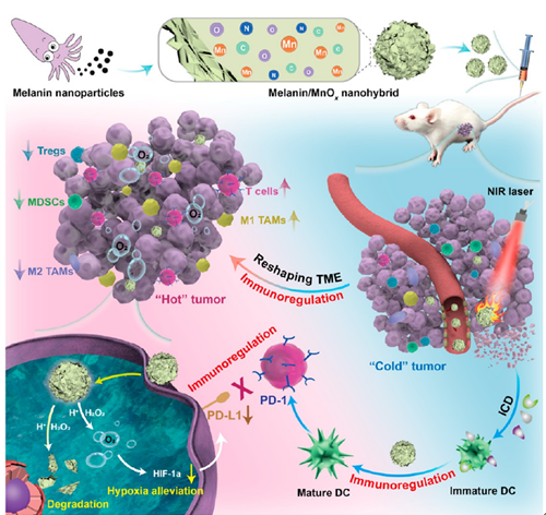 Other instructions: shelf life of half a year under sealed state [Main advantages] Under near-infrared (NIR) light irradiation, the photothermal properties of hybrid nanoparticles trigger ICD and release tumor-related antigens, and work together with Mn 2 + to promote dendritic cell maturation and activate anti-tumor immunity. Furthermore, the autoimmune modulatory nature of hybrid nanoparticles could reshape the immunosuppressive TME and downregulate the programmed death ligand-1 by relieving oxygen deprivation and acidic TME.