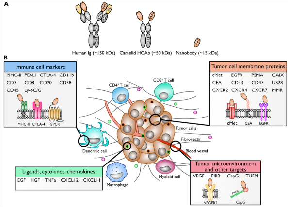 常見的腫瘤微環(huán)境納米抗體開發(fā)靶點(diǎn)[3]
