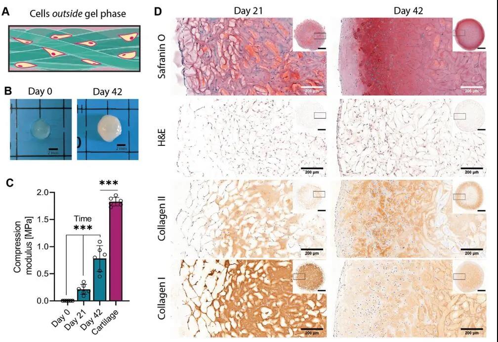 負載軟骨細胞的HA-MA纏結微束型凝膠培養42天后,凝膠塊呈白色軟骨狀,表明了致密的細胞外基質沉積。為了證實這一點,研究者對培養的組織結構進行軟骨特異性標志物染色,染色結果表明相關的蛋白多糖、Ⅰ型膠原和Ⅱ型膠原均得到高表達,其中Ⅱ型膠原在42天后,膠原染色增強,表現為微束內沉積及水凝膠網絡中的沉積。隨后,研究者對比了3D打印凝膠微束負載軟骨細胞培養21天及42天前后的壓縮模量,其模量由2.7 ± 0.3 kPa增加至212 ± 83.7 kPa,后增加至780.2 ± 218.4 kPa。雖然此機械強度遠不及原生軟骨組織的壓縮模量(1829.8 ± 72 kPa),但仍是一個顯著的進步。由于本研究中使用的材料本身的抗壓縮能力很小,壓縮模量的變化完全可以歸因于細胞外基質的大量沉積和成熟(圖7)。