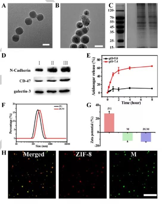 本文要點(diǎn):(1)該仿生平臺(tái)具有豐富的受體,不僅可以選擇性地靶向同型細(xì)胞,還可以實(shí)現(xiàn)對(duì)不同乳腺癌亞型的選擇性MGL。此外,具有內(nèi)溶酶體逃逸性能的ZIF-8可使得疊氮糖從溶酶體中逃逸并加速其代謝整合。