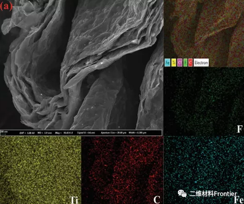 從掃描電鏡中可以清楚地觀察到FTC的每一個側層,周圍元素作圖顯示,Ti、C、F和Fe元素在FTC中均勻分散。