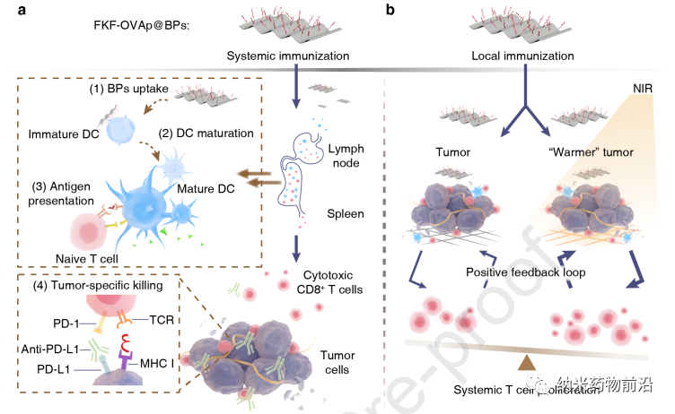 本文利用苯丙氨酸-賴氨酸-苯丙氨酸(FKF)三肽修飾的抗原表位對BPs進行簡單的包覆以制備FKF-OVAp@BP納米疫苗,它具有高負載能力、高效的藥物遞送、可激活樹突狀細胞(DC)的性能和良好的生物相容性,能夠用于癌癥免疫治療。在小鼠模型中,該納米疫苗可通過系統免疫以誘導產生有效的抗腫瘤細胞免疫,并顯著增強對黑色素瘤的檢查點封鎖(CPB)治療效果。此外,BPs的近紅外(NIR)光熱效應也能夠為改善局部免疫提供一個有利的免疫微環境。綜上所述,這一研究為利用納米佐劑將免疫活性與光熱效應相結合以增強癌癥免疫治療提供了新的策略,有望進一步推動用于癌癥治療的多功能輔助型納米材料的開發和應用。