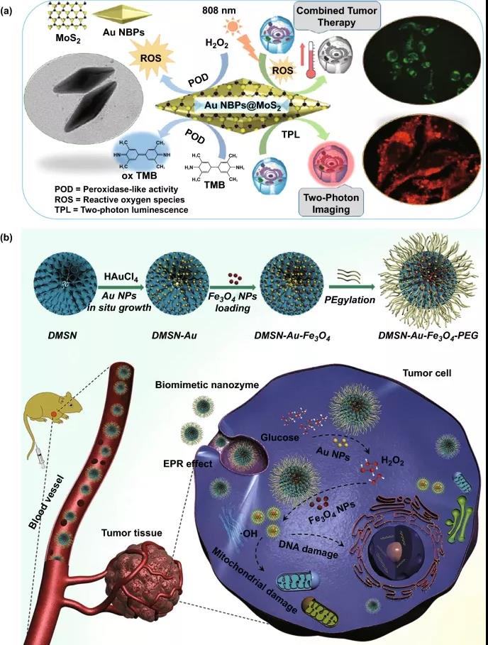 6. 應用于腫瘤治療的金納米酶。(a) 過氧化物酶樣活性與光動力和光熱療法相結合,用于腫瘤成像和局部治療。(b) 在將NPs引導至相應的組織后,各種酶活性結合在一起在細胞內產生ROS。
