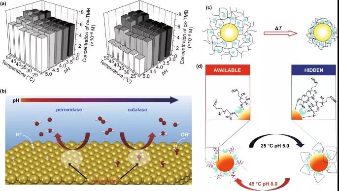圖3. AuNPs不同催化活性對pH和溫度的依賴性。(a) 涂有不同濃度相同肽(左側高3倍)的AUNP對溫度和pH變化的反應不同,因為它們具有類似過氧化物酶的氧化3,3′,5,5′-四甲基聯苯胺(TMB)的能力,(b) 金納米粒子在堿性條件下吸附于金表面,表現出不同的H₂O₂分解途徑,(c) 用于穩定AuNPs的熱敏性聚合物層可能經歷結構變化,從而阻止納米材料的催化活性狀態,(d) “開/關”納米酶通過溫度和pH值變化進行控制,從而通過AuNP表面聚合物鏈之間的氫鍵形成籠狀結構。