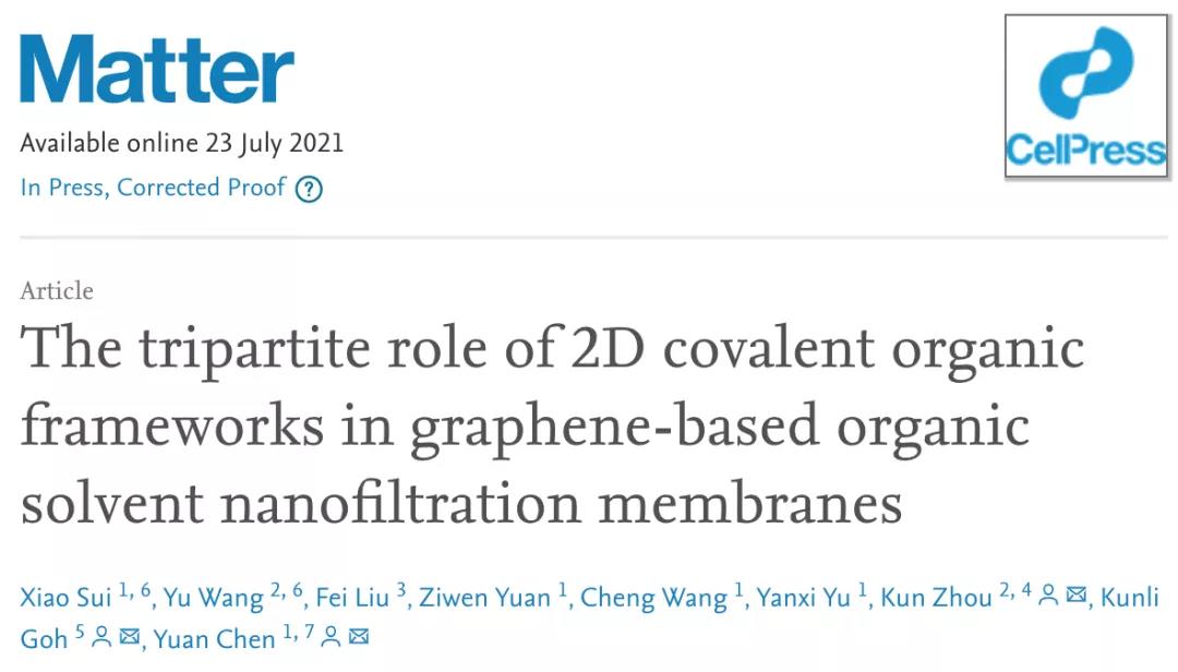 二維COF在石墨烯有機物分離納濾膜中的三重作用第一作者:隋瀟, 王彧通訊作者:陳元 *,吳昆勵 *,周琨*單位:悉尼大學(xué),新加坡膜科學(xué)研究中心,南洋理工大學(xué)