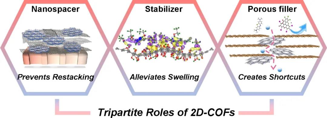 有機物的分離對于制藥,催化和石油化工來說至關(guān)重要。相比于傳統(tǒng)的高分子聚合膜來說,石墨烯膜在有機體系下更穩(wěn)定,因此被認為是在有機分離中非常有吸引力的材料。但是,石墨烯薄膜由于狹窄曲折的層間距導(dǎo)致溶液通量較低。之前有研究表明在石墨烯膜中插入二維共價有機框架(COF)作為層間間隔物可以增大膜的層間距來提升通量。而這個新發(fā)表的工作通過實驗與計算相結(jié)合發(fā)現(xiàn)二維COF不僅僅只是間隔物,它在有機分離體系石墨烯膜中起到了間隔物,穩(wěn)定劑和多孔填充物的三重作用。插入二維COF后,膜性能的提升主要源于COF作為穩(wěn)定劑和多孔填充物的作用,而非以往所認為的間隔物的作用。這一新觀點有助于未來對于二維材料薄膜用于有機分離體系的設(shè)計與應(yīng)用。
