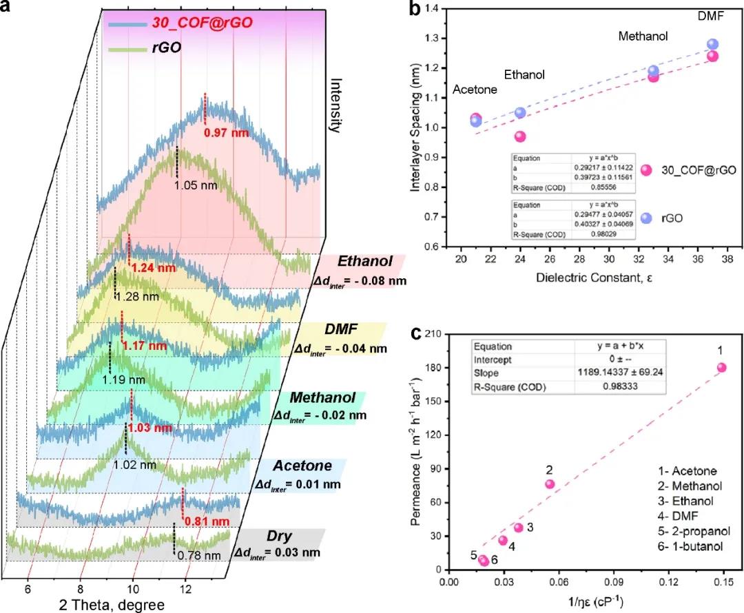 XRD結(jié)果表面,干燥條件下,插入COF的雜化薄膜的層間距大于純rGO薄膜。然而,在不同有機溶劑中,插入COF的雜化薄膜的層間距不但沒有大于,反而小于或者接近于純rGO薄膜的層間距。這表明COF的插入可以緩解層間距在有機溶劑中的溶脹,從而加強穩(wěn)定性。并且,溶劑的通量和溶劑的粘度和介電常數(shù)密切相關(guān)。