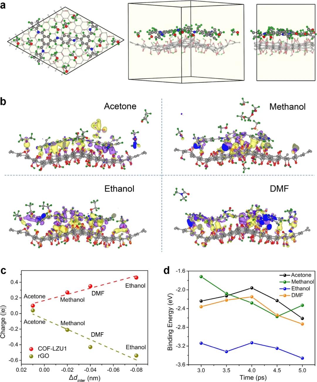 計算結(jié)果表明,COF可緩解rGO層間距在有機溶劑中的溶脹是因為溶液誘發(fā)了電荷在COF/rGO界面的重新排布。這個電荷排布導(dǎo)致了一個在COF與rGO之間的吸引力的產(chǎn)生。并且在不同溶劑中的吸引力大小不一樣,從而導(dǎo)致層間距在不同溶劑中的不同。