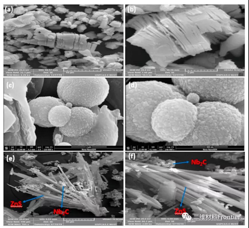 圖1.(a,b)Nb2C分別在10μm和2μm下的SEM結果,(c,d)硫化鋅團聚在1μm和500nm處的SEM圖像,(e,f)Nb2C/ZnS納米復合材料的SEM圖像。
