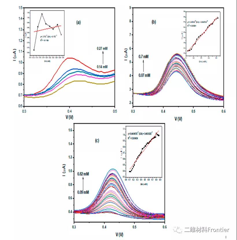 圖4.(a)GCE/Nb2C、(b)GCE/ZnS和(c)GCE/nb2C/ZnS的DPV伏安圖。插入的是對應電極(PBSpH3、掃描率Scat50mVs∓1、步長電位5mV、步長電位5mV)的電流與DA濃度的線性圖,間隔時間為0.5s)。