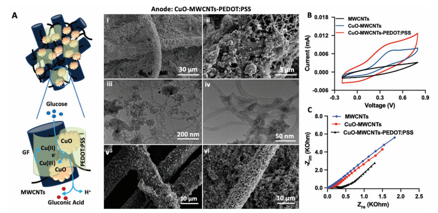 可穿戴和可植入的電子設(shè)備在生理信息的現(xiàn)場監(jiān)測和為實(shí)時(shí)醫(yī)療干預(yù)提供信息方面已經(jīng)變得越來越強(qiáng)大。無論這種生物電子設(shè)備和植入物是使用光作為電遺傳控制的中間物,還是基于電場的直接電遺傳界面,它們都需要大量的電能來支持監(jiān)測、處理和通信。因此,目前可用的生物電子植入物不能使用電池供電,但需要有線、或無線電源,來進(jìn)行連續(xù)操作,這限制了自充足性、可靠性和患者的方便性。理想情況下,最好是使用內(nèi)源性電源來操作生物電子植入物,以實(shí)現(xiàn)自給自足、連續(xù)和可靠的操作。在這里,通過集成分層裝飾的柔性三維納米結(jié)構(gòu)無機(jī)氧化銅催化劑,我們制造了一個(gè)代謝燃料電池,在生理血糖濃度下產(chǎn)生超過330 mV的OCV。代謝向電能的有效轉(zhuǎn)化是由納米催化氧化銅介導(dǎo)的,它將葡萄糖轉(zhuǎn)化為葡萄糖酸鹽并生成質(zhì)子,同時(shí)通過彈道傳輸將電子通過由導(dǎo)電填料PEDOT:PSS支撐的主干。該填充物與MWCNTs壁上的自由π電子相互作用,導(dǎo)致π-π結(jié)合,其中PEDOT寡核苷酸形成與PSS鏈排列的導(dǎo)電簇,從而形成局部導(dǎo)電顆粒,增加電子的彈道傳輸。由此產(chǎn)生的代謝燃料細(xì)胞不僅能在整個(gè)生理血糖范圍內(nèi)有效地感知葡萄糖,而且還能在很長一段時(shí)間內(nèi)保持其性能和穩(wěn)定性。代謝燃料電池在生理?xiàng)l件下將多余的代謝能量轉(zhuǎn)化為電能,有望為生物電子植入物和可穿戴電子設(shè)備的應(yīng)用開辟許多新的機(jī)會(huì)。