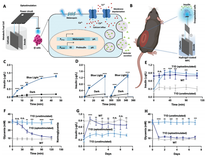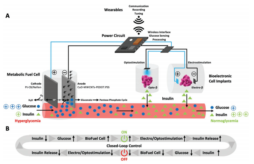 目前可用的生物電子設(shè)備消耗太多的能量,無法在可充電電池上連續(xù)運(yùn)行,而且通常是無線供電,伴隨著可靠性、便利性和移動(dòng)性等問題。因此,一種在生理?xiàng)l件下工作的強(qiáng)大的、自給自足的、可植入的發(fā)電機(jī)的可用性將對許多應(yīng)用產(chǎn)生革命性的影響,從驅(qū)動(dòng)生物電子植入物和假體到編程細(xì)胞行為和患者的新陳代謝。在這里,利用一種新的含銅、導(dǎo)電性調(diào)諧的3D碳納米管復(fù)合材料,設(shè)計(jì)了一種可植入的血糖代謝燃料電池,該電池可以連續(xù)監(jiān)測血糖水平,在高血糖期間將多余的葡萄糖轉(zhuǎn)化為電能,并產(chǎn)生足夠的能量(0.7 mW/cm-2, 0.9 V, 50 mM葡萄糖)來驅(qū)動(dòng)工程細(xì)胞泡狀胰島素釋放的光和電遺傳調(diào)節(jié)。研究表明,在I型糖尿病的實(shí)驗(yàn)?zāi)P椭,通過結(jié)合電代謝轉(zhuǎn)化和胰島素釋放介導(dǎo)的細(xì)胞消耗,將血糖監(jiān)測與消除過量血糖相結(jié)合,使代謝燃料電池能夠以自動(dòng)、自給自足和閉環(huán)的方式恢復(fù)血糖穩(wěn)態(tài)。