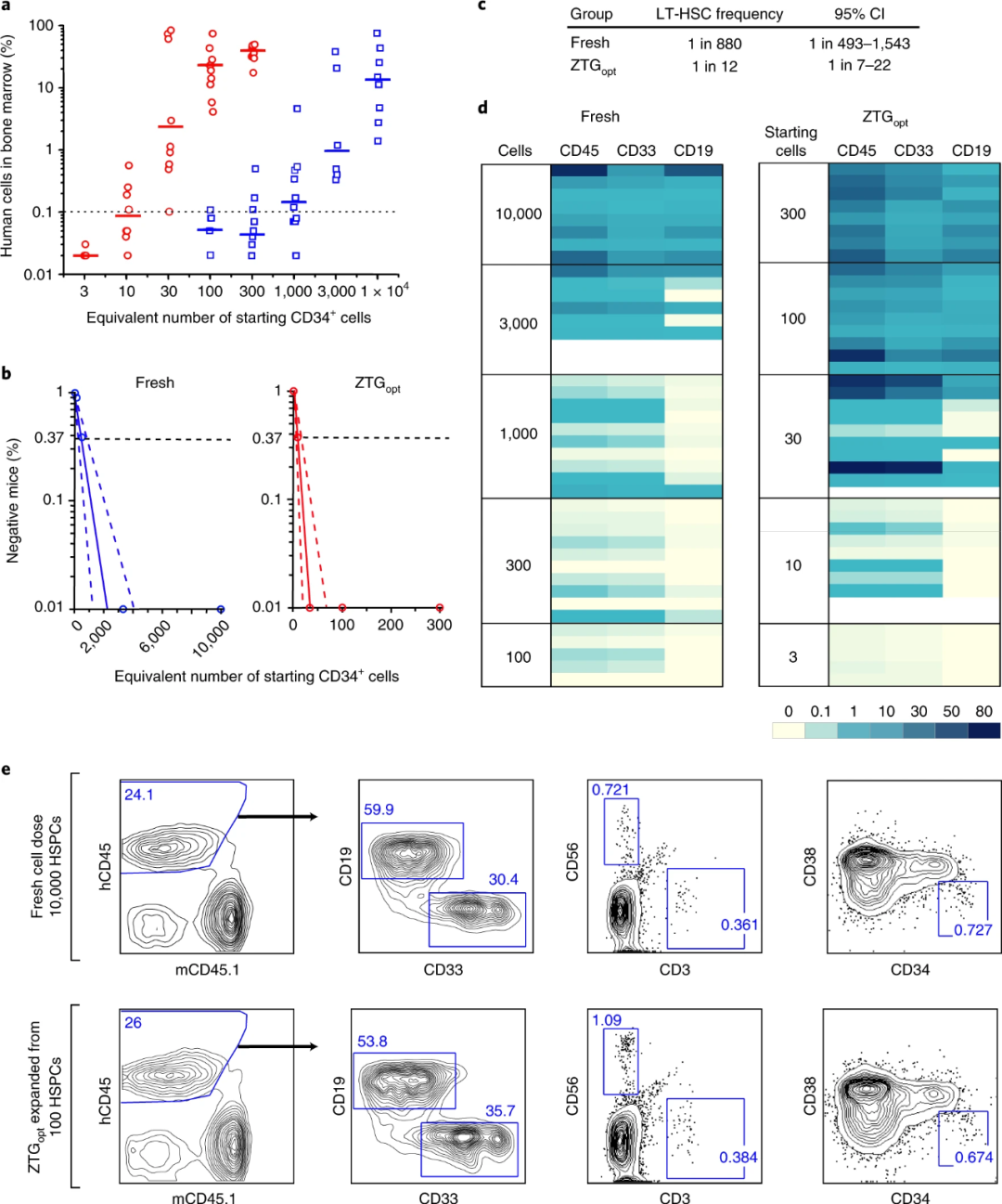 ZTG opt方式培養的臍帶血來源的CD34 + HSPC在體內可保持擴增能力已得到證明,研究人員又利用有限稀釋分析(LDA)來檢測中長期再生造血干細胞(LT-HSC)的擴增頻率的情況。實驗結果如圖3所示,在移植后24–30周后,ZTG opt方式培養的LT-HSC的擴增頻率遠高于其他培養方式。有限稀釋分析和二次移植實驗均證明ZTG培養擴增了具有長期造血功能的LT-HSC細胞。