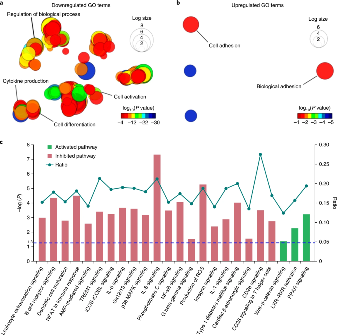 為了更深入地了解ZTG水凝膠內的CD34 + HSPC的活性,研究人員利用mRNA深度測序(RNA-seq)進行了基因表達譜分析。如圖6所示,與新鮮分離的原代HSPC相比,超過10,000個基因的表達在ZTG培養的HSPC中沒有顯著變化。對比其他培養方式,ZTG培養組中與細胞分化,細胞活化和細胞因子產生相關的基因顯著下調,再次表明ZTG培養方式可減緩細胞代謝過程。