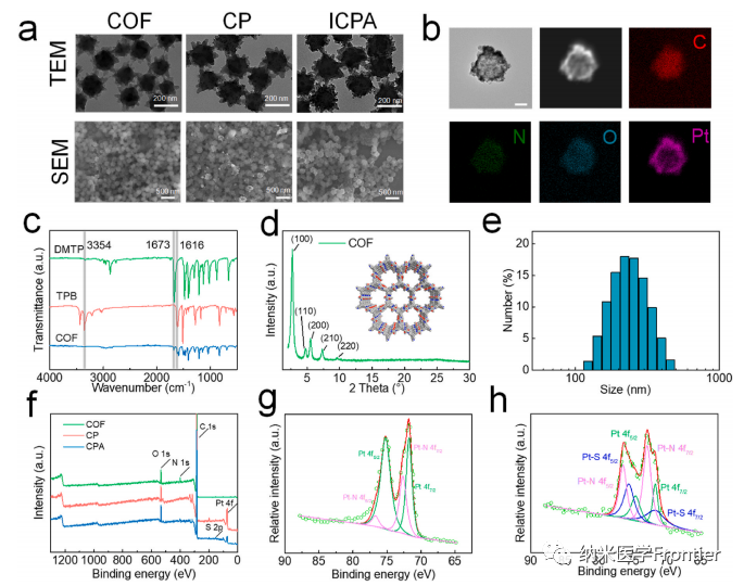共價有機框架(COF)已成為納米醫學的一個有前景的平臺,但由于缺乏有效的 COF 修飾策略,開發多功能 COF 納米平臺仍然具有挑戰性。在此,本文提出了一種用于COF功能化的納米酶橋接(NZB)策略。作為過氧化氫酶模擬物的鉑納米顆粒(Pt NPs)原位生長在COF NPs的表面上,而不降低其載藥能力(CP),并且硫醇封端的適體通過穩定的Pt-S鍵進一步致密地裝飾到CP NPs上 (CPA)。Pt納米酶工程和適體功能化使納米平臺具有優異的光熱轉換、腫瘤靶向和過氧化氫酶樣催化性能。使用臨床批準的光敏劑吲哚菁綠(ICG)作為模型藥物,制造了用于腫瘤靶向自強化治療的納米系統(ICPA)。ICPA能夠有效地積聚到腫瘤組織中,通過分解過度表達的H2O2并產生O2來緩解缺氧微環境。在單波長近紅外光照射下,ICPA的類過氧化氫酶催化和單線態氧生成活性顯著增強,從而以自我強化的方式對惡性細胞和荷瘤小鼠產生良好的光催化治療效果。
