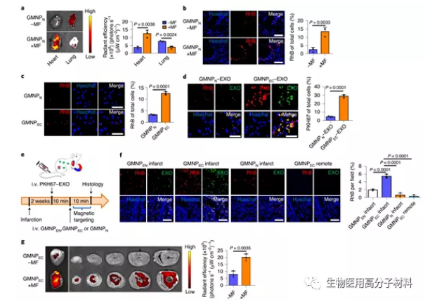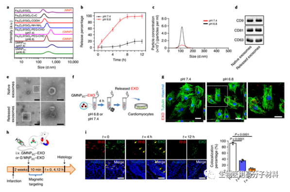 The systemic biodistribution of endogenous extracellular vesicles is essential for maintaining tissue homeostasis. The research team of Professor Jin Yan from the Fourth Military Medical University and Professor Chen Xin from Xi’an Jiaotong University used magnetic nanoparticles to collect circulating exosomes and release them locally in the infarcted heart tissue. Exosomes can promote angiogenesis in the infarcted heart tissue, and the function of the heart is also improved. The nanoparticles use Fe3O4 as the core and silica as the shell layer. Finally, the silica shell is modified with polyethylene glycol bonded to the two antibodies through the hydrazone bond. Among them, one antibody binds to the CD63 antigen on the surface of extracellular vesicles, and the other antibody binds to the surface marker myosin light chain on the damaged cardiomyocytes. Under the action of a local magnetic field, nanoparticles are enriched in the damaged heart tissue, and the hydrazone bond will be broken in this acidic environment, causing the captured extracellular vesicles to be released at the damaged heart tissue. In the rabbit and rat models of myocardial infarction, under the guidance of a magnetic field, nanoparticles can capture and release exosomes, which can reduce the area of infarction. Through this method, the biodistribution of endogenous exosomes can be manipulated to treat other diseases.