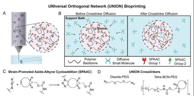 Biological 3D printing technology is a kind of potential tissue-like structure manufacturing technology, but the lack of diversity of bio-inks is a major factor limiting its development. In order to meet this demand for a universally applicable bio-ink strategy, the team of Professor Sarah C. Heilshorn of Stanford University has developed a universal bio-orthogonal bio-ink cross-linking mechanism, which is compatible with cells and with a series of polymers Achieve cross-linking, and published an article titled "3D Bioprinting using UNIversal Orthogonal Network (UNION) Bioinks" in Advanced Functional Materials magazine, prepared with gelatin, hyaluronic acid (HA), recombinant elastin-like protein (ELP) and Polyethylene glycol (PEG) as the main polymer of the general orthogonal network (joint) bio-ink. And its printability, mechanical properties, diffusion coefficient, etc. were characterized. And use general orthogonal hydrogel to load matrix adherent human corneal mesenchymal stromal cells and non-matrix adherent human induced pluripotent stem cells for printing experiments. After printing, the cells still maintain high viability and express characteristic phenotypic markers.