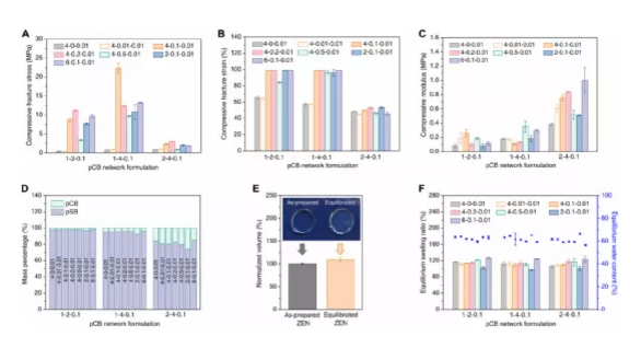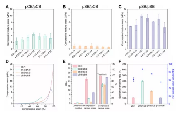 First, an orthogonal compression test was performed on the pCB/pCB hydrogel to test the effect when pSB is not the main component network (Figure 3, A, D and E). Unsurprisingly, without pSB as the main component network for locking, all pCB/pCB hydrogels showed a large volume increase after reaching equilibrium in water (Figure 3F), resulting in weaker mechanical properties. Among all pCB/pCB combinations, the highest fracture stress is only one-fifth of pCB/pSB ZEN hydrogel. In the pSB/pCB system (Figure 3, B, D, E, and F), where pSB is a secondary component network, since the hydrogel increases by 120% of its original size after reaching equilibrium, there is no locking effect. . The fracture stress is only about 1 MPa. On the other hand, in the pSB/pSB system (Figure 3, C to F), the locking effect was observed as expected, and the equilibrium volume increased slightly, about 7.9%.