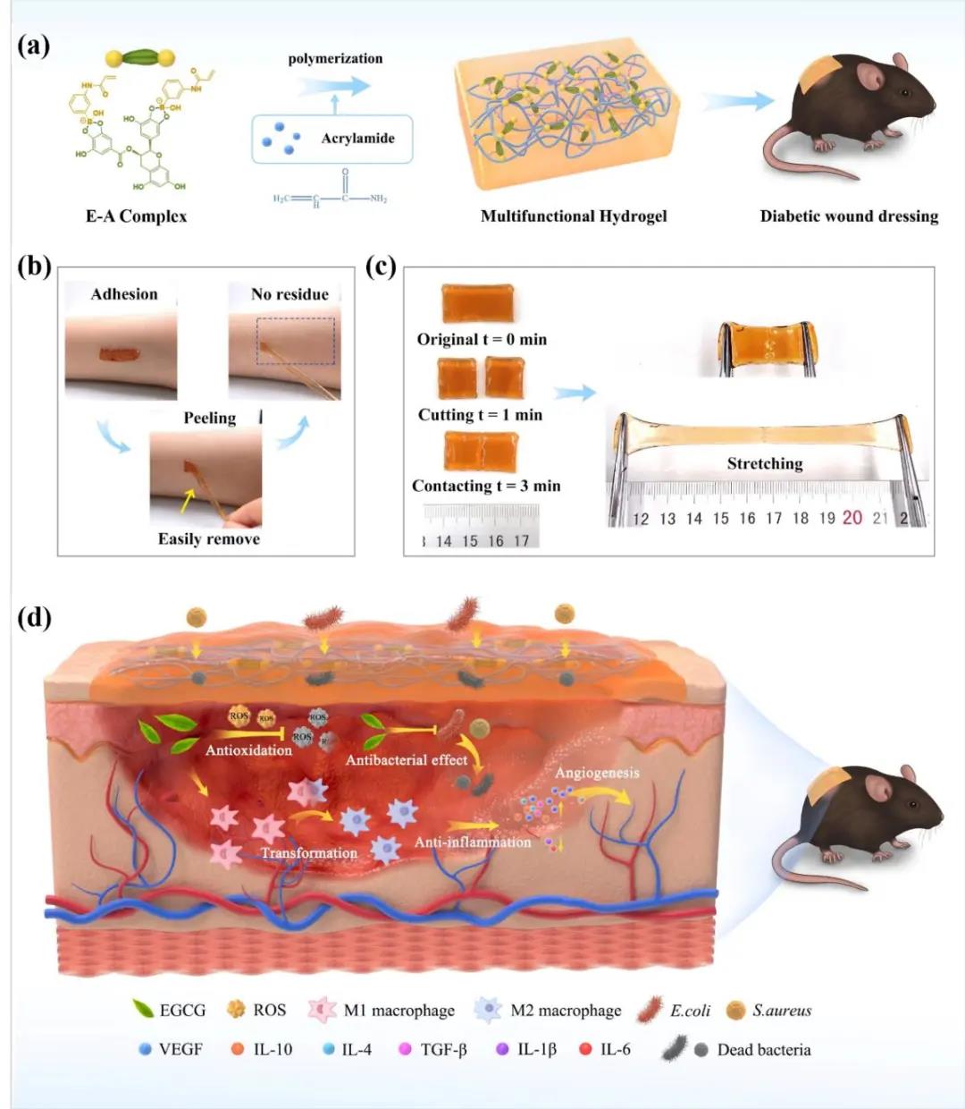 The new hydrogel wound dressing developed by the research group has the following advantages: First, it has excellent mechanical properties and rapid self-repair function. By introducing dynamic phenylborate bonds, it can effectively avoid secondary infections caused by local body movement and dressing rupture; second, it has good tissue adhesion, antibacterial, anti-inflammatory and antioxidant functions. Compared with commercial dressing films, the introduction of EGCG hydrogel system can significantly accelerate wound closure, promote anti-inflammatory factors (IL-4, IL-10), vascular endothelial growth factor (VEGF) and transforming growth factor (TGF-β) ) Expression, accelerate the transformation of macrophages M1-M2 in the wound area, and inhibit the expression of pro-inflammatory factors IL-1β and IL-6. The third is to greatly improve the convenience of dressing replacement to avoid secondary wounds. With the release of EGCG, the adhesiveness of the gel system decreases and the dressing can be easily removed. At present, the research team is accelerating the application and exploration of this new hydrogel wound dressing in diabetic oral mucosal wound repair.