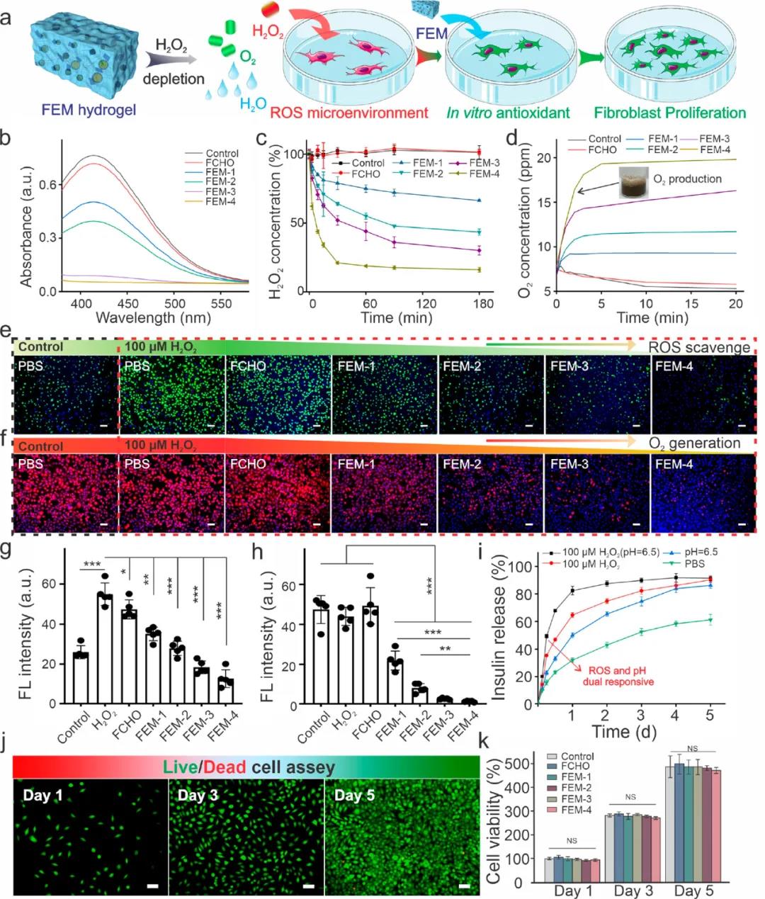 2. FEM dressing has continuous antibacterial and free radical elimination ability. Elevated glucose in diabetic patients participates in the mass production of ROS, which hinders wound healing. The addition of manganese dioxide can effectively eliminate ROS and supplement oxygen. Compared with the hydrogen peroxide control group, fibroblasts co-incubated with FEM-4 hydrogel showed significantly lower green fluorescence, indicating that FEM hydrogel can effectively alleviate intracellular oxidative stress. (Figure 3e)