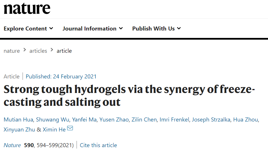 References: Hua, M., Wu, S., Ma, Y. et al. Strong tough hydrogels via the synergy of freeze-casting and salting out. Nature 590, 594–599 (2021).https://doi. org/10.1038/s41586-021-03212-z