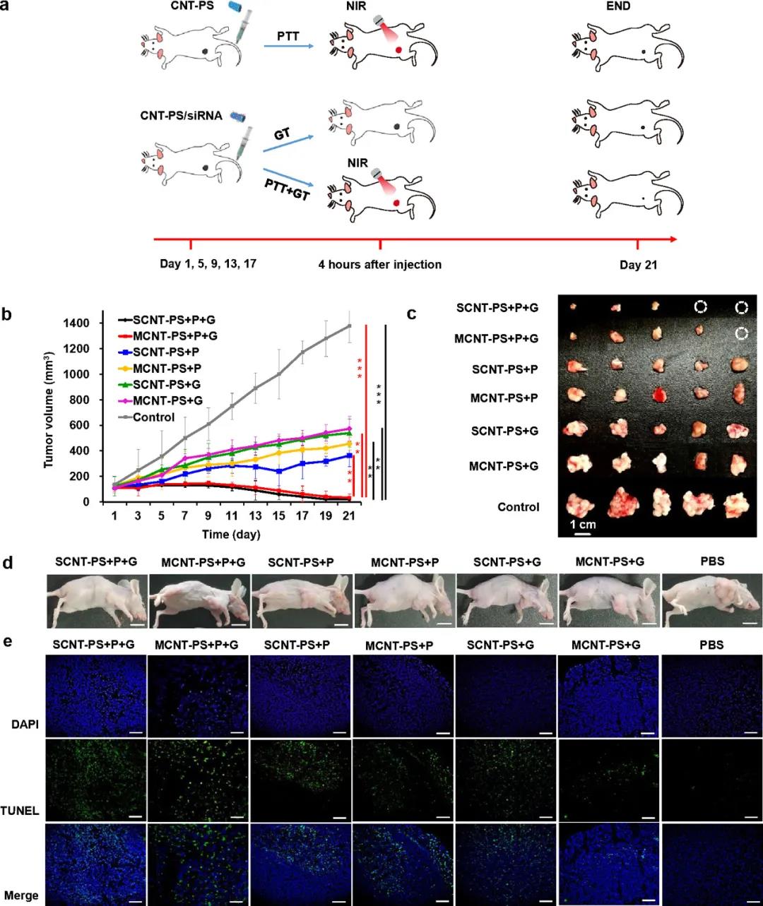 In summary, this paper constructs bifunctional lipid-coated single-wall and multi-wall CNT delivery systems (SCNT-PS and MCNT-PS) through the self-assembly of PL and SL on CNTs. After loading therapeutic siRNA, the combination of PTT and GT produced significant tumor suppression effects in vivo and in vitro. It is worth noting that some tumors even disappeared completely after 21 days of treatment with SCNT-PS/siRNA. The researchers attributed this significant inhibition of tumor growth to the temperature sensitivity of the lipids used in the carrier. These lipids give dual-functional nanoparticles a high ability to deliver siRNA to tumor cells, as well as excellent temperature-controlled gene release inside tumor cells. In addition, SCNT-PS and MCNT-PS nanoparticles have no obvious cytotoxic effect when the concentration is as high as 60μg/mL or is non-toxic to mice. In summary, CNT-PS nanoparticles are a promising tool for future clinical cancer treatment.