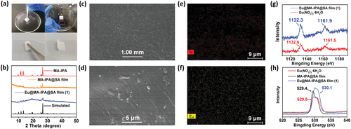 Fig. 1a) photo 1. b) Ma-ipa (blue line) and 1 (red line) experimental PXRD diagram and simulated PXRD diagram (black line). c. D) SEM images of EDX mapping images of N and EU elements in 1. E, f) 1, g) XPS spectra of EU 3D electrons in EU (NO3) 3 · 6H2O and 1. H) O 1s in EU (NO3) 3 · 6H2O MA-IPA@SA Film and 1