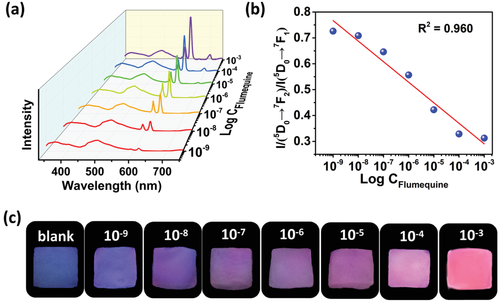FIG. 4A) emission spectra of 1 extracted from different concentrations of FQ solution (10-9 – 10-3 m)( λ ex=310 nm)。 b) The dependence of emission intensity ratio at 593 nm (5d0 → 7F1) and 616 nm (5d0 → 7f2) on FQ concentration( λ ex=310 nm)。 c) The photo of 1 taken from FQ solution was emitted, and the concentration increased from 10-9 to 10-3 M.