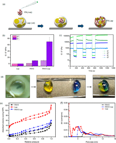 Fig. 4. the surface and mechanical properties of the hydrogel. A schematic diagram of the preparation of a) PAH3-Lap hydrogel. B) compared with PAH3-Lap hydrogel, the storage (G) and loss (G) modulus of PAH3 and Lap. C) time scanning rheometer shows thixotropy of PAH3 and PAH3-Lap hydrogels. D) optical image shows the firmness and self healing ability of PAH3-Lap hydrogel. N2 adsorption isotherms of E) PAH3 (square curve), Lap (circular curve) and PAH3-Lap (triangular curve) xerogels. F) cumulative pore volume of PAH3, Lap and PAH3-Lap xerogels.