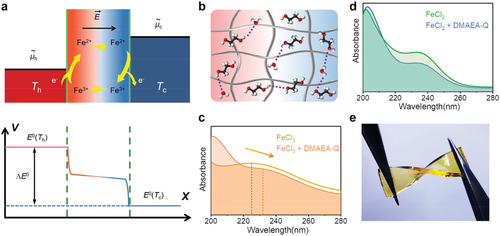 Figure 1 design of a thermal battery operating at sub zero temperature. The design of thermal battery working under the temperature below zero. a) The electrochemical potential (𝜇 ~) carrying diagram of charge and the corresponding voltage distribution of reversible redox reaction Fe3 + + e − ⇋ Fe2 +, where e is the built-in electric field. B) a schematic diagram of an organic hydrogel thermal battery containing a crosslinking network, EG and water under temperature gradient. The extra eg can destroy the ice lattice and expand the operating temperature below zero. c) The UV Vis spectra of FeCl3 and the mixture of dmaea-q and FeCl3 in the binary solvent system of EG and water were studied. d) The UV Vis spectra of FeCl2 and the mixture of dmaea-q and FeCl2 in the binary solvent system of EG and water were studied. E) photographs of soft and stretchable organic hydrogel thermal batteries.