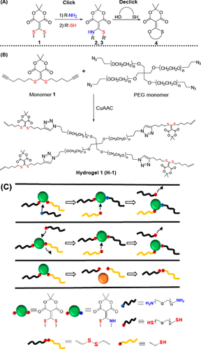 (a) click reactions of conjugated receptors perturbed by amine mercaptan and mercaptan mercaptan, and click reactions of newly formed amine mercaptan conjugated receptors added with DTT under aqueous conditions, (B) A schematic diagram of the exchange process between the H-1 azide terminated four arm poly (ethylene glycol) (PEG) and the alkyne terminated conjugated receptor 1, as well as between (c) H-1 and the representative chemical structure matrix, is formed by cuaac click reaction