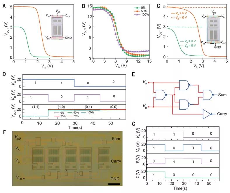 Finally, the inverter and NAND gate are fabricated. The channel length of the flexible inverter is only 10 μ m. The spatial resolution is one order of magnitude higher than that reported previously. When the logic input status is 0 and 1, the inverter can also work normally under 100% strain (Fig. 5b). The normal operation of more complex logic XOR gates (24 transistor integrated) and half adders (30 transistor integrated) shows the uniformity and high yield of all cell devices.
