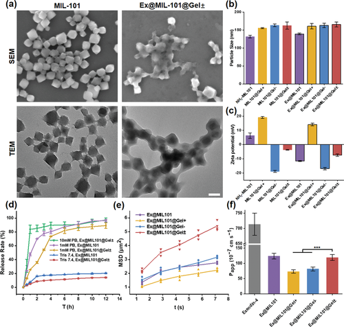 Fig. 1a) nh2-mil101 and Ex@MIL101 @SEM and TEM images of gel ± were obtained. B) particle size and C) zeta potential of blank NH2-MIL101 and blank MIL101 nanoparticles, with positive charge, negative charge or zwitterionic hydrogel coating (respectively). MIL101@Gel+ 、 MIL101@Gel − or MIL101@Gel And nanoparticles loaded with exendin-4, including Ex@MIL101 、 Ex@MIL101 @Gel+、 Ex@MIL101 @Gel − and Ex@MIL101 @Gel±, In 0.05 M Tris HCl buffer (pH 7.4). d) Ex@MIL101 And Ex@MIL100 @Exendin-4 accumulated in gel ± was released. e) The mean square displacement (MSD) of MOF gel nanoparticles containing exendin-4 in porcine mucin solution is a function of time. f) The apparent permeability coefficient (Papp) of exendin-4 in different formulations crossed the pig solution layer.