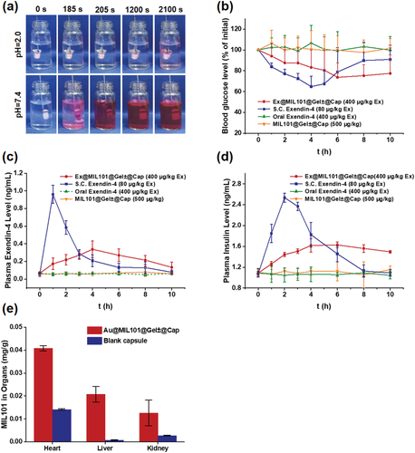 FIG. 4A) photos of pH sensitive disintegration and payload release of pH triggered self unpacking capsules. B) the blood glucose level and time curve of diabetic rats treated with different exendin-4 preparations. C) plasma exendin-4 level and D) plasma insulin level and time curve in diabetic rats treated with different exendin-4 preparations. e) Wistar rats were orally administered with Au@MIL101 @The pH of gel ± was triggered in the organs 4 hours after the capsule was released Au@MIL101 @The amount of gel +.