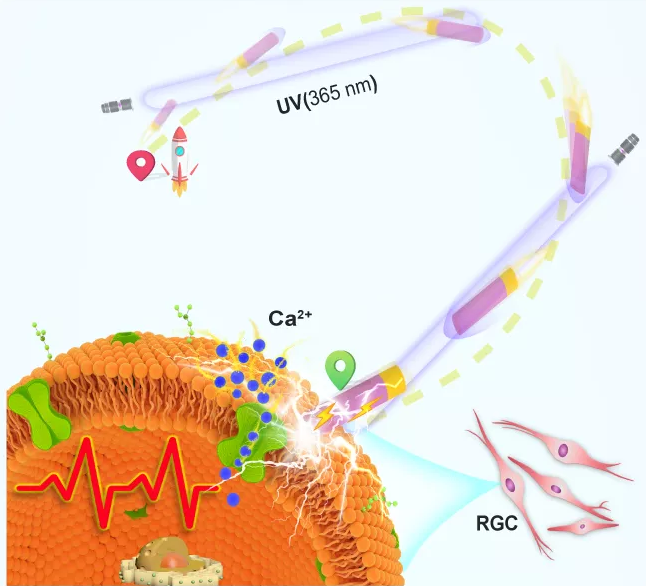 Visual impairment and even blindness have always been a major issue in medical treatment. The assisted activation of retinal ganglion cells (RGCs) contributes to the restoration of visual signal transduction circuits. According to reports, electrical stimulation generated by artificial photoreceptors can excite cells by opening calcium channels. However, the current artificial photoreceptor materials are bulky and require surgical implantation. Invasiveness is an inevitable major problem, which limits their application in organisms. In view of this, there is still a lack of a non-invasive and highly controllable method in the field of neurostimulation.