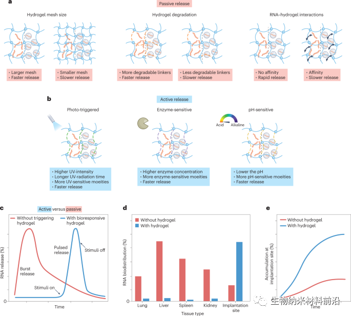This is the first comprehensive review of the application and development of hydrogels in the field of RNA delivery, covering various types of RNA drugs (such as siRNA, miRNA, mRNA, etc.) and hydrogels (such as self-assembled hydrogels, chemically cross-linked hydrogels, biologically cross-linked hydrogels, etc.). Different methods of hydrogel loading RNA (such as physical adsorption, covalent coupling, nanocomposite, etc.) and different principles of hydrogel design (such as pH-sensitive, temperature-sensitive, light-sensitive, biological enzyme-sensitive, etc.) are introduced in detail, and their respective advantages, disadvantages and scope of application are analyzed. The biomedical applications of hydrogels in RNA delivery, such as anti-tumor, anti-inflammation, anti-infection, tissue regeneration, etc., were emphasized, and some typical cases and experimental results were shown. The opportunities and challenges faced by hydrogels in RNA delivery were proposed, such as increasing drug loading, optimizing release kinetics, enhancing targeting ability, reducing immune response, etc.